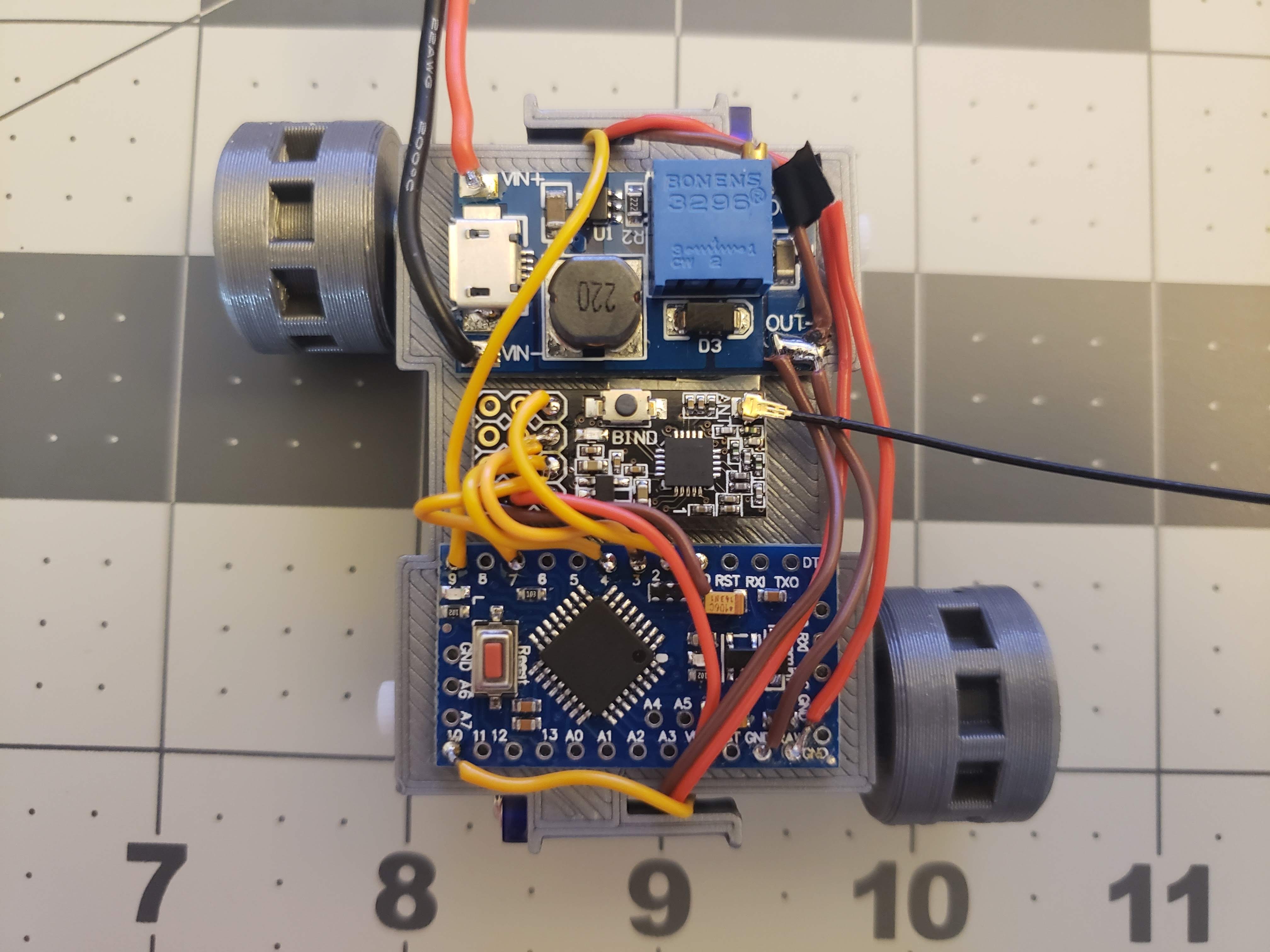 This is mini remote-controlled tank that has a small all-in-one FPV (first-person view) camera for a video feed. The tank is driven by two 9g servos and uses lego treads. I designed and 3d printed the tank frame; this project was mainly a way to practice at Fusion 360.