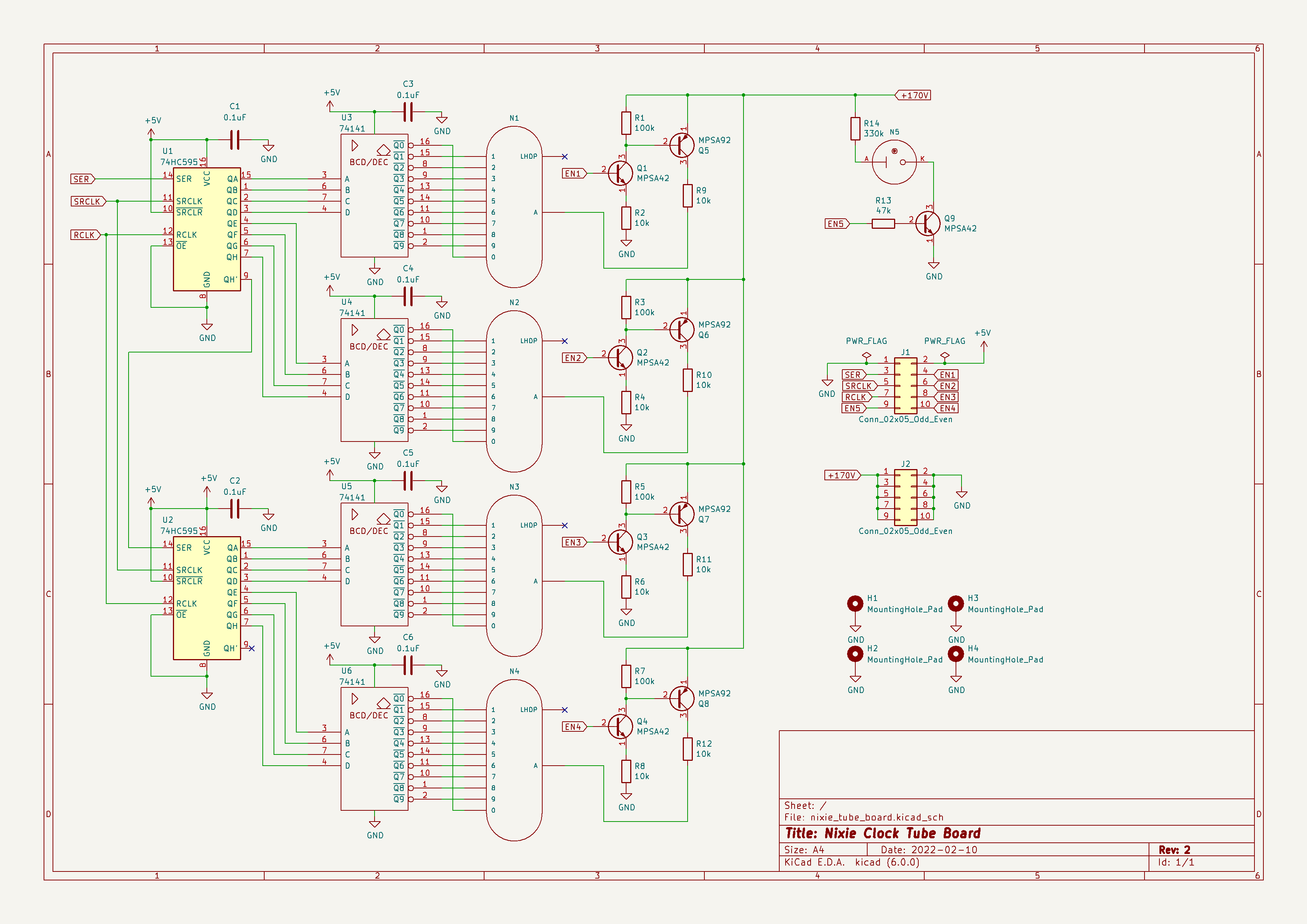 To adjust the brightness, each tube has an anode side driver consisting of an MPSA42 NPN transistor and an MPSA92 PNP transistor. The INS-1 bulb is driven by a single MPSA42 NPN transistor on the cathode side.