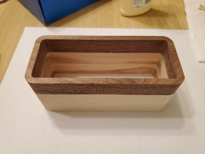 The outer shell pieces are designed to be cut from 3/4” thick boards of walnut and maple; the front/back plates from 1/4” thick walnut. I used DXF files from the KiCAD PCB design to ensure the cutouts would line up.